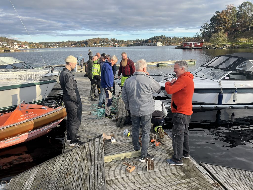 Mandag 27.10 stilte 17 mann til dugnad for å fikse småfeil på flytebrygge ved Moland Havn. Brygga ble kjøpt med noen kjente skader som måtte repareres, men trygt ledet av Roger Haugen som organiserte dugnaden og hadde kjøpt inn alt av nødvendig materiell for å utføre reparasjonene var det meste gjort unna på under 3 timer.