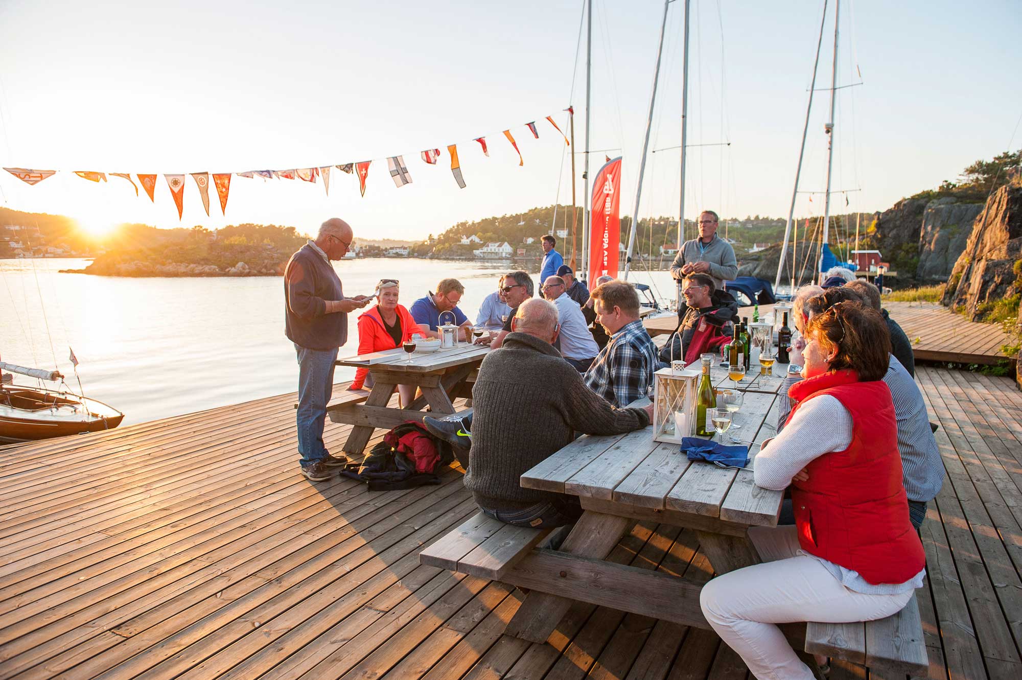 Årets sommerfest startet med samling og briefing i havna. 11 båter stilte og vi fikk en frisk seilas med kraftig sørvest og kryss ut Galtesund. Langs merdølandet ble vi filmet fra luften fra drone. Noen opptak som med stor suksess ble vist senere på kvelden. Takk til Fredrik Eikevoll Hansen for opptakene!
